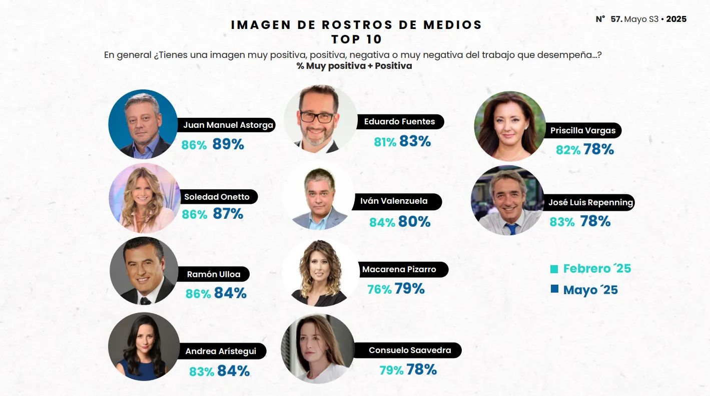 En la categoría Imagen de rostros de medios Top 10, los encuestados eligieron a los animadores mejor evaluados tras contestar la interrogante: "¿Tienes una imagen muy positiva, positiva, negativa o muy negativa del trabajo que desempeña…?".