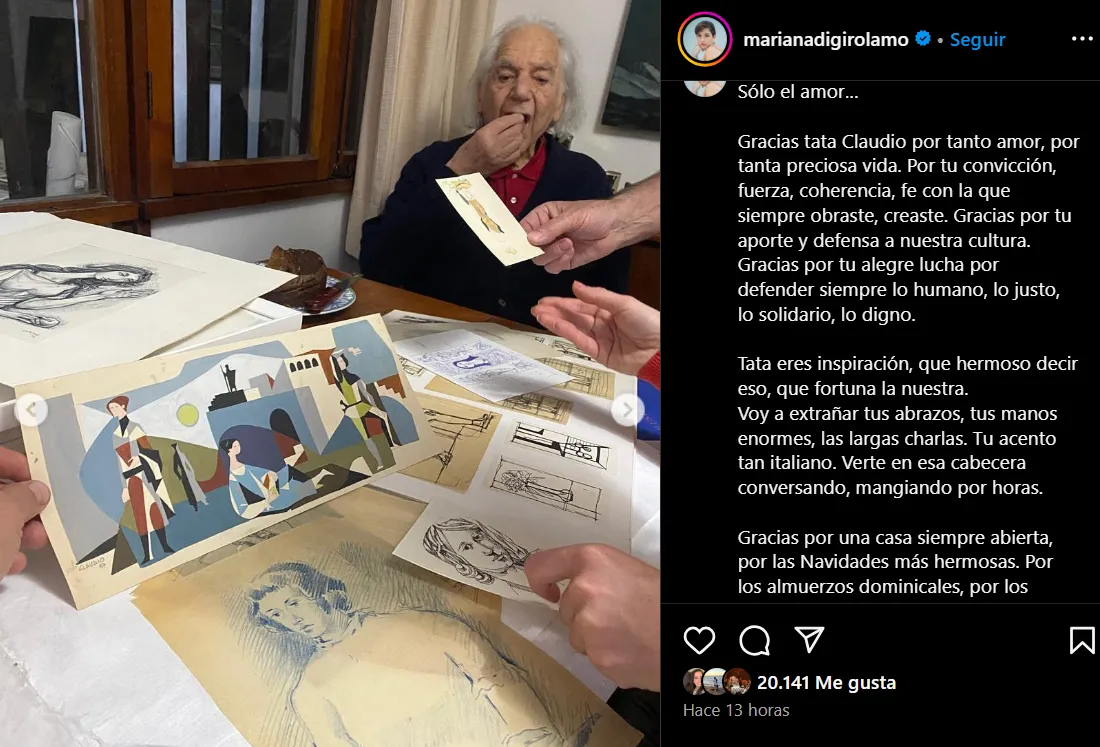 "Sólo el amor… gracias tata Claudio por tanto amor, por tanta preciosa vida. Por tu convicción, fuerza, coherencia, fe con la que siempre obraste, creaste. Gracias por tu aporte y defensa a nuestra cultura. Gracias por tu alegre lucha por defender siempre lo humano, lo justo, lo solidario, lo digno", comenzó en el post compartido en Instagram.