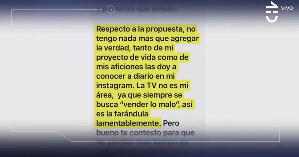"Tanto de mi proyecto de vida, como de mis aficiones las doy a conocer a diario en mi Instagram. La TV no es mi área, ya que siempre se busca 'vender lo malo'. Así es la farándula, lamentablemente", sostuvo.