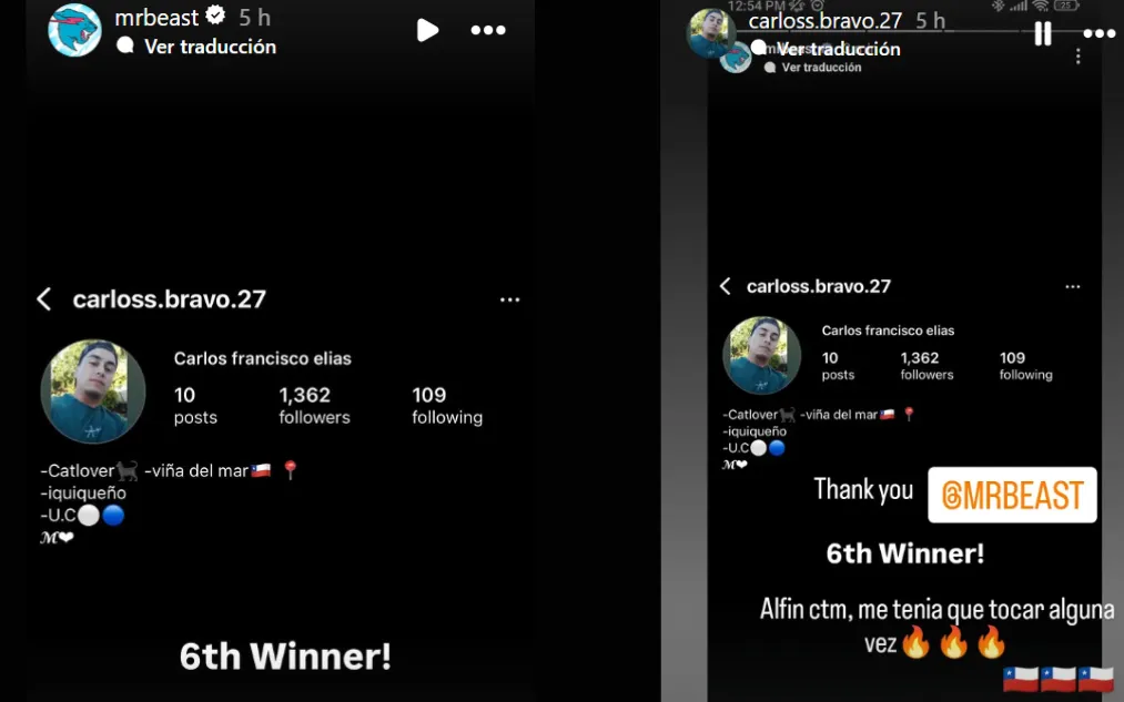 El youtuber MrBeast sorprendió al anunciar que un chileno resultó se uno de los ganadores de un sorteo de 50 mil dólares, equivalente a casi 46 millones de pesos. Carlos, un joven de 28 años de Iquique, describe la experiencia como un milagro, ya que le permitirá saldar deudas y mejorar su situación económica, tras haber abandonado sus estudios de ingeniería informática por problemas financieros. Ahora, planea invertir el premio en un departamento y evitar posibles estafas en redes sociales.