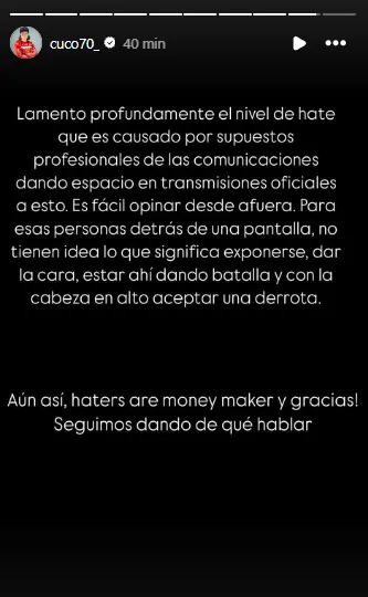 "Para esas personas detrás de una pantalla: no tienen idea lo que significa exponerse, dar la cara, estar ahí dando la batalla y con la cabeza en alto aceptar una derrota".