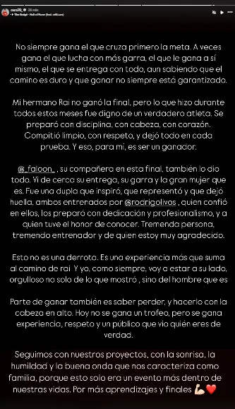 "Mi hermano Rai no ganó la final, pero lo que hizo durante todos estos meses fue digno de un verdadero atleta. Se preparó con disciplina, con cabeza, con corazón".