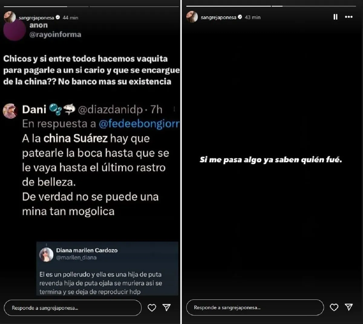 "Chicos, ¿y si entre todos hacemos vaquita para pagarle a un sicario y que se encargue de la China? No banco más su existencia", "A la China Suárez hay que patearle la boca hasta que se vaya hasta el último rastro de belleza. De verdad, no se puede una mina tan mongólica (sic)", "Él es un pollerudo y ella es una hija de puta. Ojalá se muriera, así termina y se deja de reproducir (sic)", son los comentarios que mostró la actriz de 33 años.