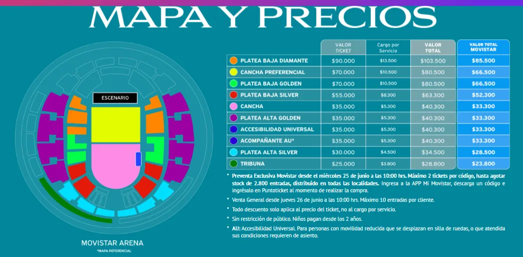 En tanto, la venta general se habilitará el jueves 26 de junio a las 10:00 horas, también por el mismo sistema. Se espera una alta demanda, por lo que se recomienda asegurar tus entradas con anticipación.
