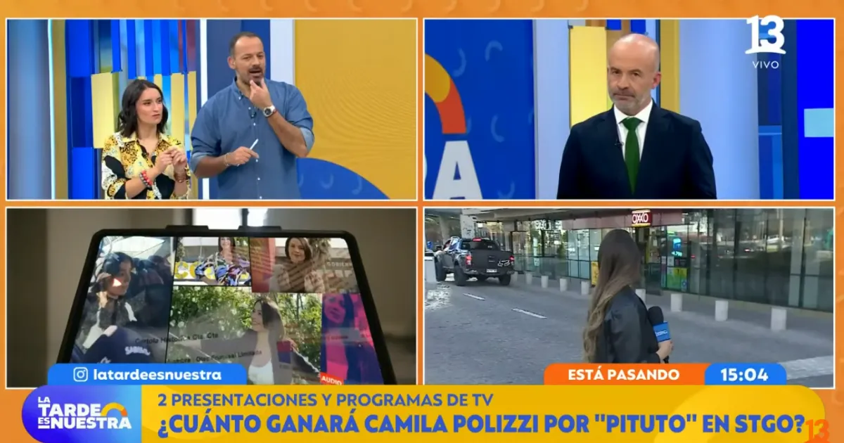 En "La Tarde es Nuestra" de Canal 13, la periodista Rocío Villalobos vivió un chascarro al informar sobre la ex candidata Camila Polizzi en Arsmate. Polizzi se fue sin previo aviso, dejando a todos sorprendidos. La periodista reveló que Polizzi estaba feliz y tranquila, preparándose para su show en Diosas Club. El conductor Alfonso Concha bromeó sobre el incidente, resaltando la anécdota con humor.