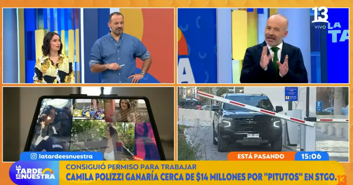 En “La Tarde es Nuestra” de Canal 13, la periodista Rocío Villalobos vivió un chascarro al informar sobre la ex candidata Camila Polizzi en Arsmate. Polizzi se fue sin previo aviso, dejando a todos sorprendidos. La periodista reveló que Polizzi estaba feliz y tranquila, preparándose para su show en Diosas Club. El conductor Alfonso Concha bromeó sobre el incidente, resaltando la anécdota con humor.