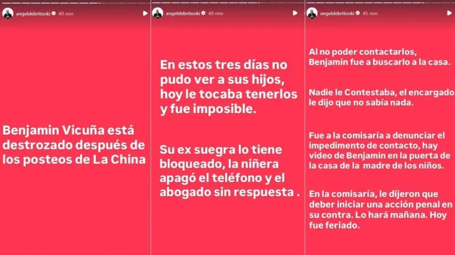 "Al no poder contactarlos, Benjamín fue a buscarlos a la casa. Nadie le contestaba, el encargado le dijo que no sabía nada. Fue a la comisaría a denunciar el impedimento de contacto, hay video de Benjamín en la puerta de la casa de la madre de los niños. En la comisaría, le dijeron que debe iniciar una acción penal en su contra. Lo hará mañana, hoy fue feriado", siguió el relato.