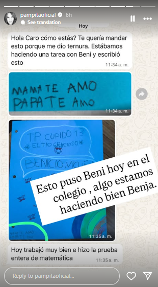 En la primera historia, Pampita publicó una carpeta de trabajo de Benicio, su hijo de 11 años, quien escribió "Mamá te amo. Papá te amo" en la portada. En la segunda historia, amplió esa parte para que se viera en todo su esplendor.