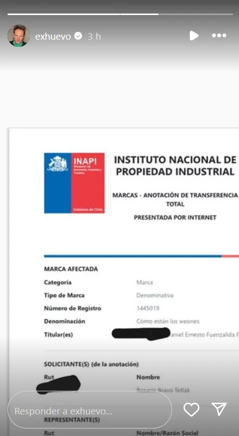 Para evitar dudas, además de este clip, Fuenzalida compartió una foto del documento legal en sus historias de Instagram, en donde aparece mencionada Rosario Bravo como la receptora del traspaso de marca.