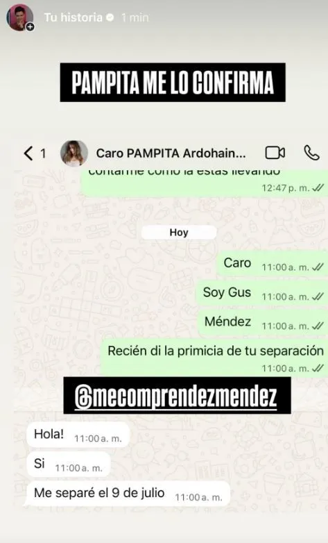 Luego, el periodista publicó el breve intercambio que mantuvo con Pampita, donde la conductora y modelo le confirmó su separación y reveló en qué fecha fue.