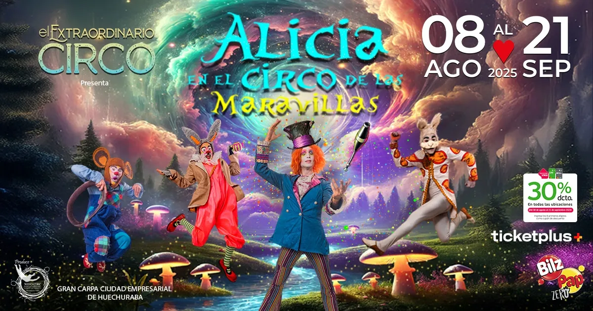 La carpa del Extraordinario Circo llega a Av. del Parque 4951, Huechuraba, con funciones desde el 8 de agosto hasta el 21 de septiembre, ofreciendo una experiencia con 20 artistas en escena, música original, acrobacias y un universo inspirado en el clásico de Lewis Carroll.