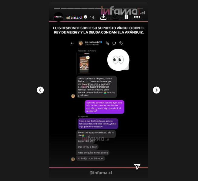En la misma conversación, además, fue consultado por los dichos de Daniela Aránguiz y las cuentas que le debería. “Pero si ya estaban saldadas, ella lo dijo, ahora otra vez. Qué te voy a decir, nada amiguito, menos de ella. Ya lo dije todo 100 veces”, cerró.