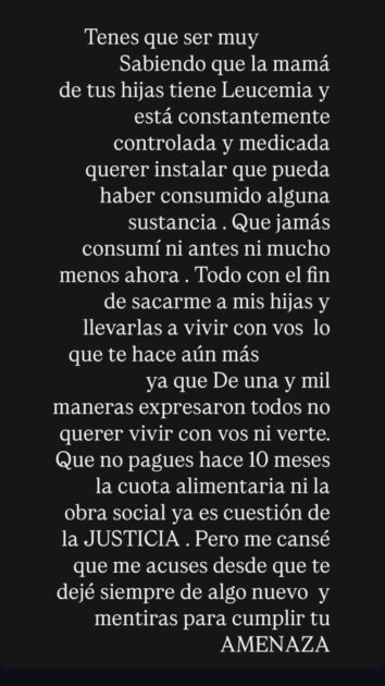 “Que no pagues hace 10 meses la cuota alimentaria ni la obra social ya es cuestión de la Justicia. Pero me cansé de que me acuses desde que te dejé, siempre de algo nuevo y mentiras para cumplir tu amenaza”.