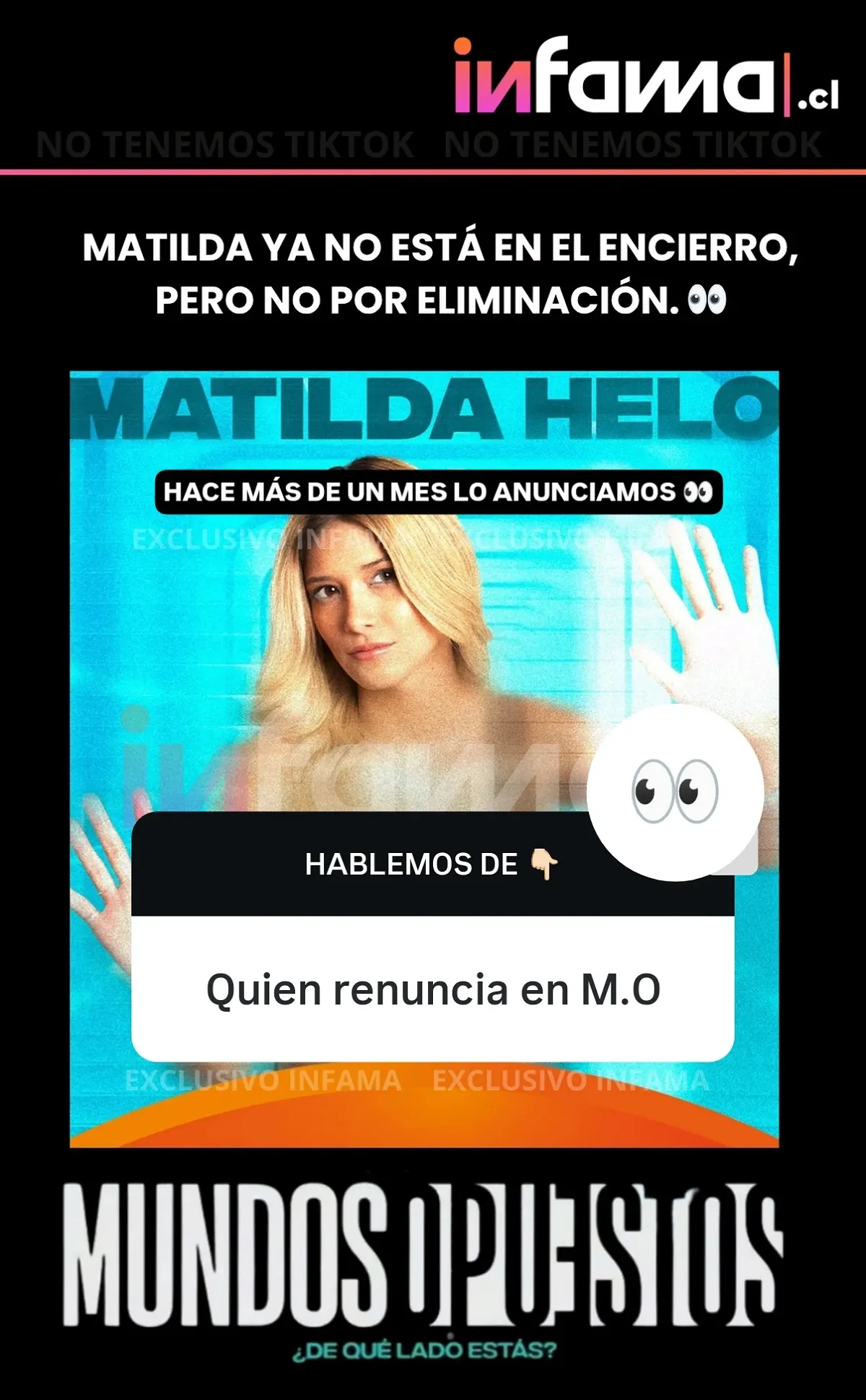 El portal Infama, que se caracteriza por dar acertados spoilers del reality, advirtió hace más de un mes que Matilda Helo no soportará las condiciones del Pasado y le dirá adiós al programa, al que ingresó tardíamente junto a José Pablo Saavedra.