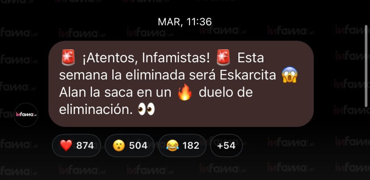 La información fue dada a conocer por el portal de farándula Infama, quienes aseguraron que la exintegrante de Gran Hermano fue eliminada en el próximo duelo que se verá en pantalla.