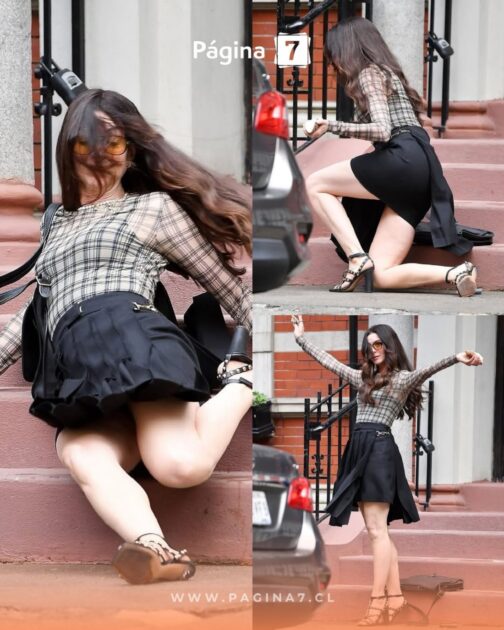La actriz lucía una falda negra hasta la rodilla, unos tirantes de color negro y, sobre ello, una blusa mesh de cuadros. Además, acompañó el outfit con unos tacones altos de tiras plateadas. Cuando bajó de las escaleras, no pisó bien y tuvo una aparatosa caída que terminó por romper uno de sus tacos.