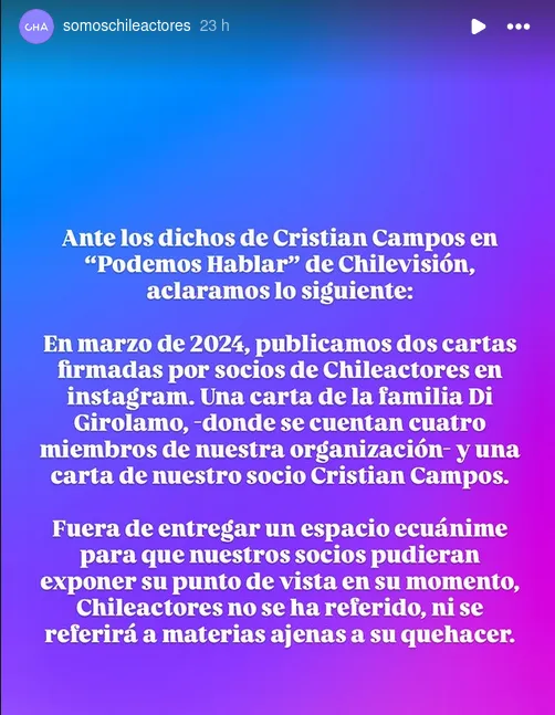 “En marzo de 2024, publicamos dos cartas firmadas por socios de Chileactores en Instagram. Una carta de la familia Di Girolamo, -donde se cuentan cuatro miembros de nuestra organización- y una carta de nuestro socio, Cristian Campos”, señalaron.