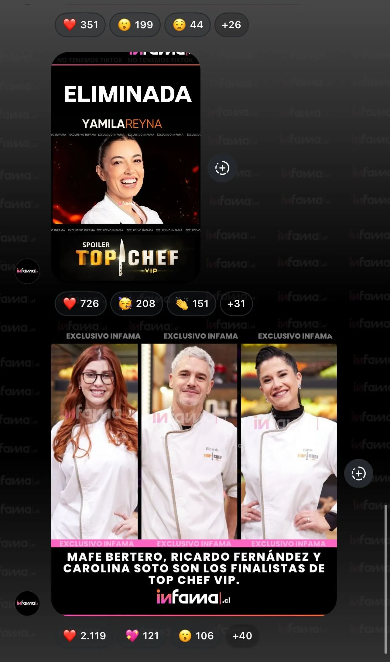 Top Chef VIP de Chilevisión está en la recta final y ya se conocen los tres finalistas: Mafe Bertero, Carolina Soto y Ricardo Fernández. A pesar de que en pantalla continúan nueve competidores, se filtraron los nombres de los que llegarán a la instancia final. Se revela que Américo y Dani Ride, que estaban entre los cinco mejores, fueron eliminados. Por otro lado, Chilevisión prepara el estreno de su nuevo programa Fiebre de Baile, conducido por Diana Bolocco, con la participación confirmada de Cony Capelli, Nicole Moreno, Kike Acuña y Pastelito Jr.