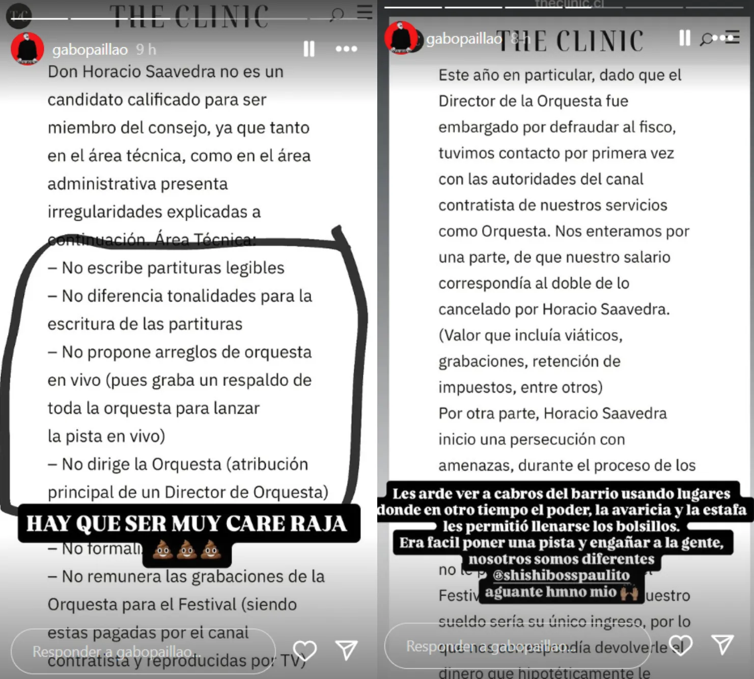 Así, Paillao compartió una carta escrita por el saxofonista Andrés Pérez Muñoz “en representación de los músicos de la Orquesta del Festival de Viña”, la cual fue publicado en 2010 The Clinic, donde solicitaban la expulsión de Saavedra del consejo de la Sociedad Chilena del Derecho de Autor (SCD).