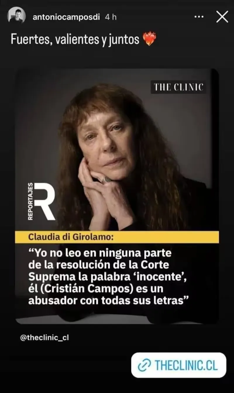Tras las declaraciones de la actriz, Antonio Campos —hijo del actor Cristián Campos— se pronunció en redes sociales. A través de una historia en Instagram, compartió la entrevista de su madre y escribió un mensaje de apoyo: “Fuertes, valientes y juntos”, consignó La Cuarta.
