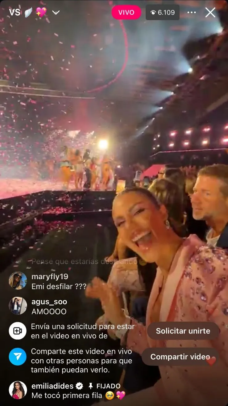 Luego, la propia Emilia comenzó una transmisión en vivo en donde se le vio lucir un elegante traje rosado y un peinado recogido en una alta cola de caballo, mientras disfrutaba del espectáculo desde la primera fila.