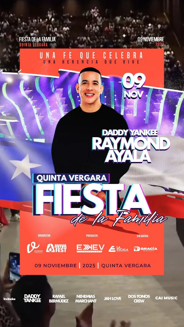 El cantante puertorriqueño Daddy Yankee, ahora bajo su nombre real Raymond Ayala, regresará a Chile el 9 de noviembre para participar en la Fiesta de la Familia en la Quinta Vergara de Viña del Mar, un evento religioso gratuito organizado por la Fundación Valparaíso Evangélico. La actividad reunirá a miles de personas en una jornada de fe, unidad y alabanza, donde Daddy Yankee transmitirá un mensaje de fe y esperanza. Además, otros artistas como Rafael Bermúdez, Nehemías Marchart, Jah Love y Dos Tonos Crew también participarán en este encuentro que marca la nueva etapa del artista enfocada en proyectos musicales con contenido cristiano.