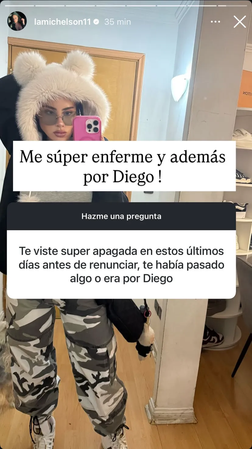 Por su parte, Ignacia Michelson recientemente se refirió a su salida a través de Instagram, respondiendo una pregunta de un seguidor que le consultó: “Te vi superapagada en estos últimos días antes de renunciar, ¿te había pasado algo o era por Diego?”.