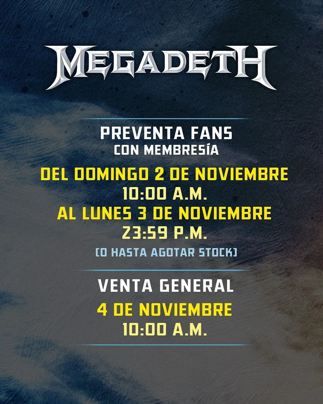 La legendaria banda de thrash metal, Megadeth, anuncia su última presentación en Chile el 5 de mayo de 2026 en el Movistar Arena, marcando su despedida de los escenarios nacionales como parte de la gira mundial "This Was Our Life". Con más de cuatro décadas de historia, la agrupación liderada por Dave Mustaine promete una noche épica para sus seguidores, ofreciendo una descarga de energía y virtuosismo junto a los talentos de Dirk Verbeuren, James LoMenzo y Teemu Mäntysaari. Megadeth, reconocida por su impresionante trayectoria con más de 50 millones de discos vendidos y múltiples premios, se despide en un evento que resumirá la esencia de una de las "Cuatro Grandes" del metal.