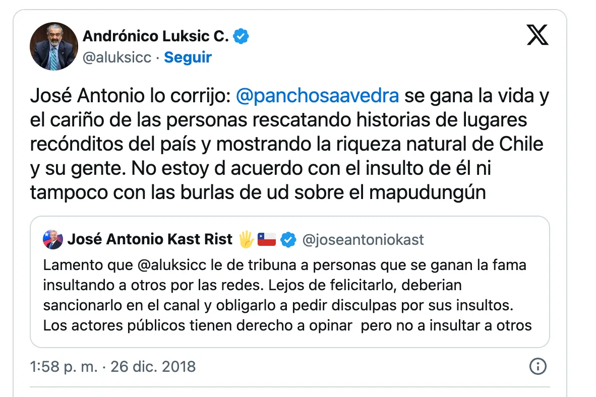 "Lamento que Andrónico Luksic le dé tribuna a personas que se ganan la fama insultando a otros por las redes. Lejos de felicitarlo, deberían sancionarlo en el canal y obligarlo a pedir disculpas por sus insultos. Los actores públicos tienen derecho a opinar, pero no a insultar a otros", replicó Kast.