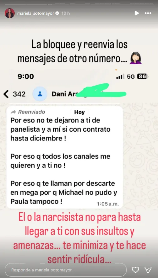 La disputa entre Mariela Sotomayor y Daniela Aránguiz escaló tras la filtración de un supuesto chat de la ex Mekano por parte de la periodista, revelando descalificaciones y aludiendo a que la habían bloqueado. En los mensajes, Aránguiz mencionó su contrato en televisión y desestimó la carrera de Sotomayor. La publicación de Sotomayor generó reacciones en redes sociales, donde alertó sobre el comportamiento narcisista y agresivo de la otra persona. Este episodio agrega más tensión a la ya compleja relación entre ambas figuras televisivas.