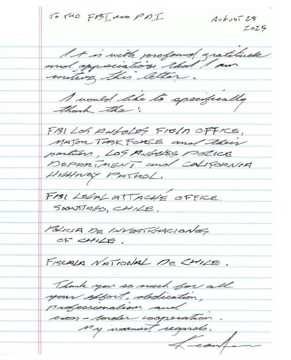 La misiva, sencilla, pero emotiva, cerró con su firma y un mensaje de gratitud hacia los equipos que trabajaron en el caso.