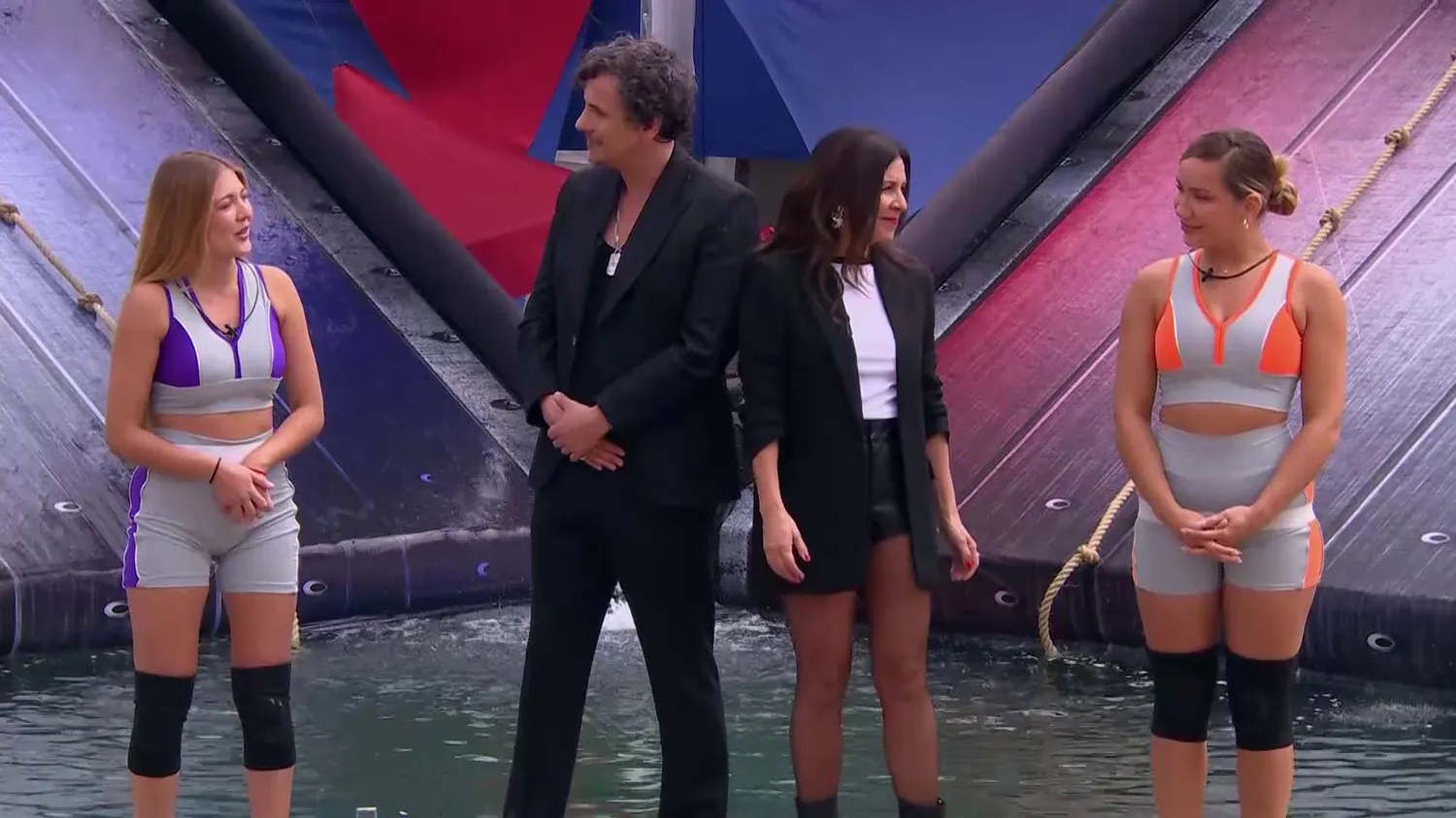 El desafío incluyó flotar sobre balsas en la piscina, alcanzar el borde, trepar por sogas hasta lo más alto de la estructura, y recoger cinco testimonios para encajarlos con precisión en un pedestal.