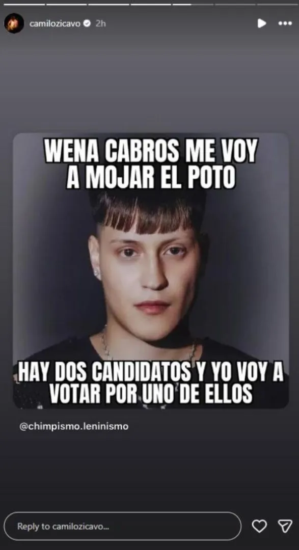 El cantante chileno Camilo Zicavo respondió con humor a las declaraciones políticas del músico urbano Kidd Voodoo, quien se pronunció sobre su postura de cara a la segunda vuelta presidencial. Kidd Voodoo afirmó que su decisión estaba clara ahora que solo quedaban dos candidatos en contienda, generando críticas en redes sociales. En un meme compartido en Instagram, Zicavo ironizó sobre la situación, mostrando a Kidd Voodoo con la frase: "Me voy a mojar el poto y voy a votar por uno de los dos candidatos". La reacción del vocalista de Plumas generó polémica entre los seguidores de ambos artistas.