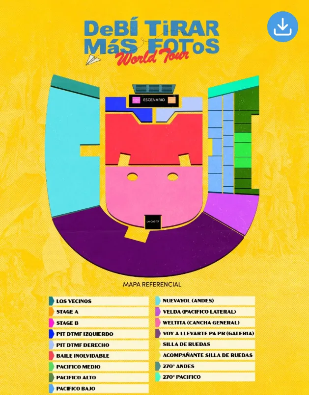 Bad Bunny regresa a Chile con su DeBÍ TiRAR MáS FOToS World Tour y Bizarro Live Entertainment anuncia ajustes en los conciertos en el Estadio Nacional siguiendo lineamientos internacionales. Se incorpora un nuevo escenario "La Casita" y se rediseñan áreas como "Los Vecinos" y "Stage A". Se elimina la pasarela original y se ofrecen opciones para quienes compren entradas afectadas: mantener su entrada con el nuevo diseño del mapa o solicitar la devolución del 100% del importe antes del 22 de diciembre de 2025. Las entradas devueltas se pondrán a la venta el 24 de diciembre a través de Puntoticket.