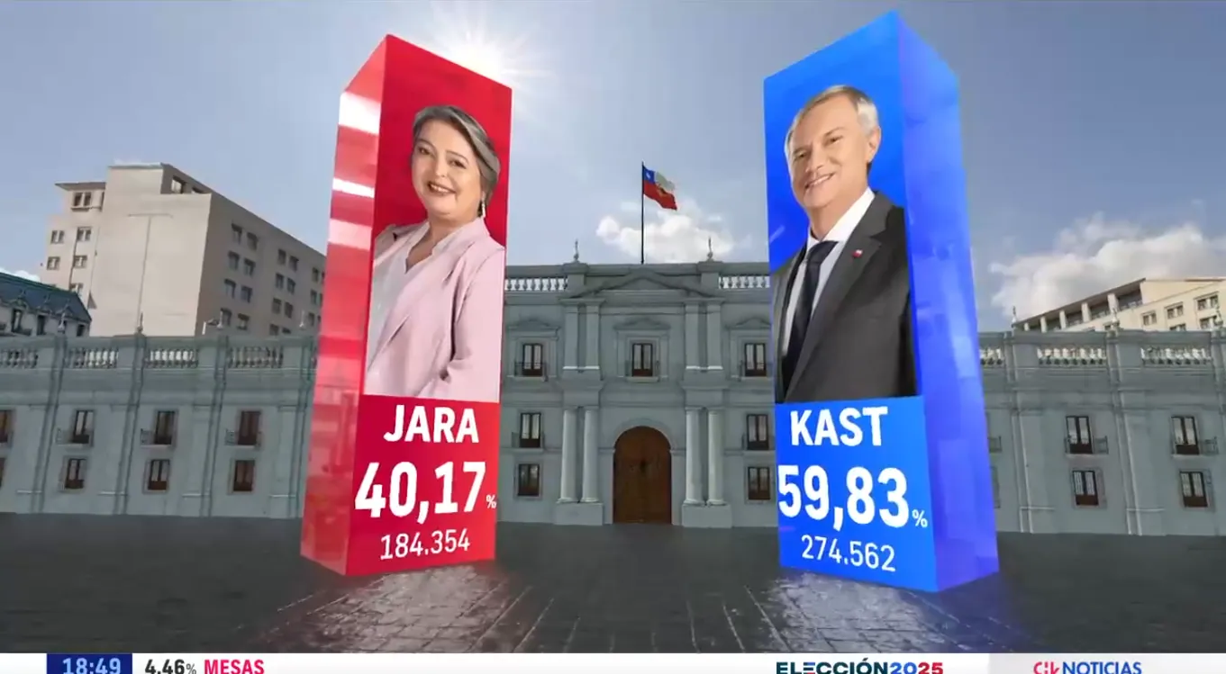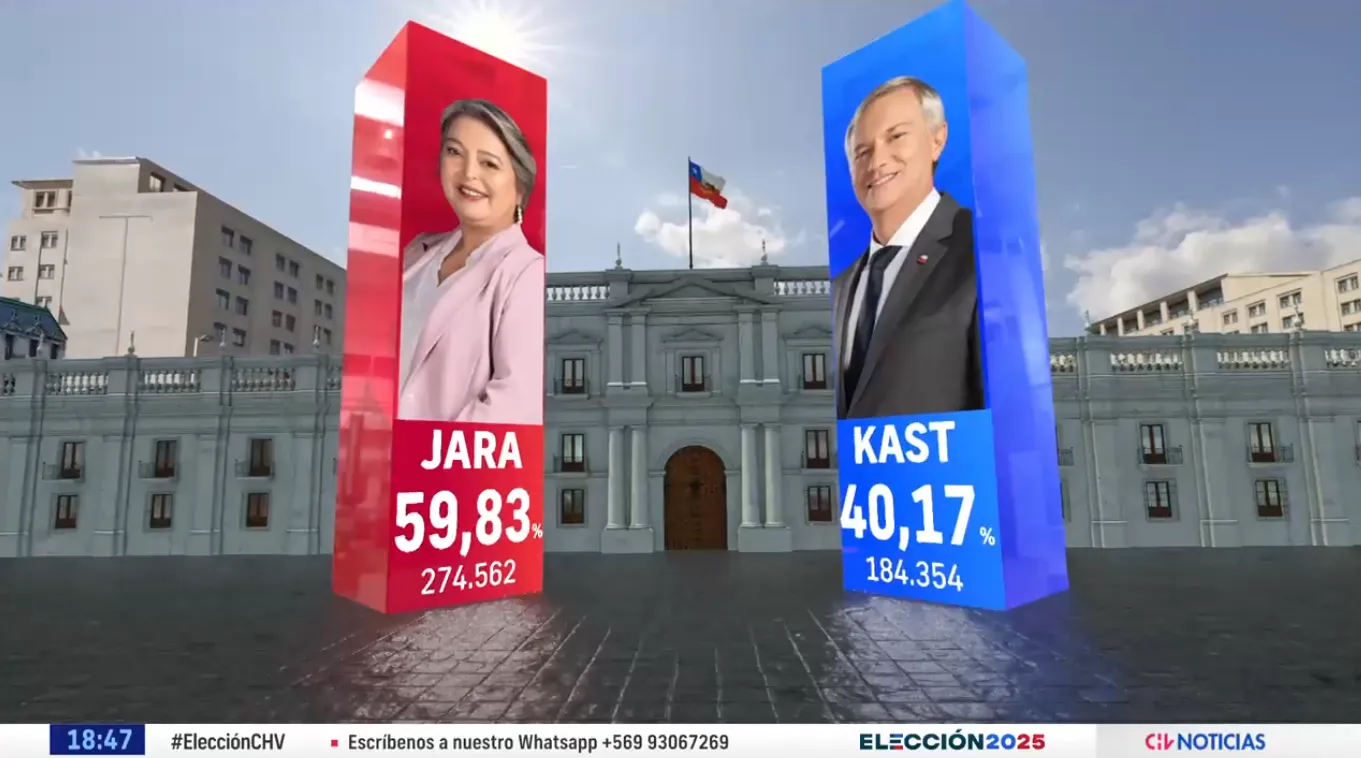 CHV transmitió las Elecciones Presidenciales 2025, mostrando resultados erróneos en el primer cómputo oficial del Servel. Se proyectó a Jeanette Jara con 59,83% vs. José Antonio Kast con 40,17%, pero se rectificó la información en vivo. Macarena Pizarro y Daniel Matamala pidieron corregir los porcentajes en pantalla durante la transmisión especial.