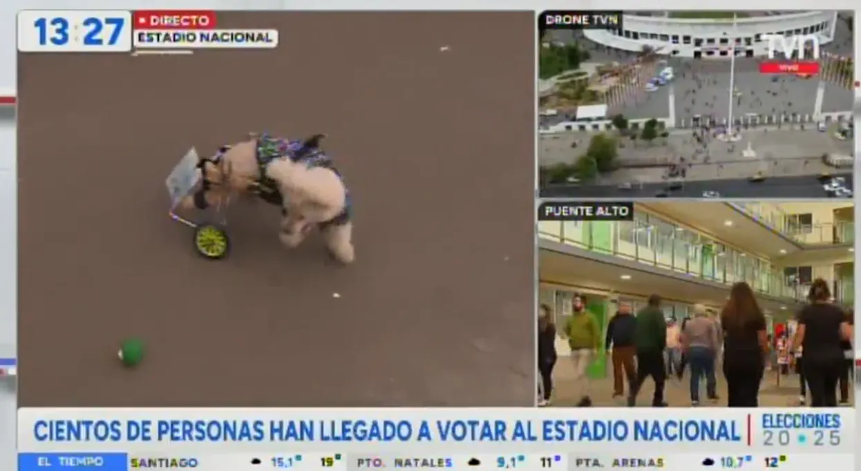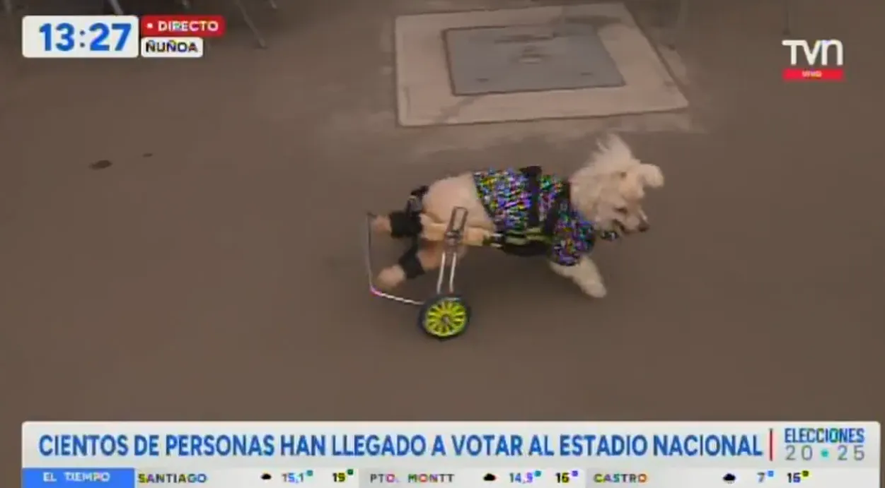En medio de la cobertura de las Elecciones Presidenciales 2025 en el Estadio Nacional, el perrito Bruno, que se desplaza en un carrito por una discapacidad en sus patas traseras, capturó la atención de la periodista Carla Zunino de TVN. Presentado como un ejemplo de superación, Bruno, de 12 años y con una década en situación de discapacidad, fue acompañado por su dueña Natalia, quien detalló la historia del canino tras sufrir una negligencia médica. Zunino destacó la importancia de brindar oportunidades a animales con necesidades especiales, resaltando que Bruno lleva una vida normal y solo requiere un poco más de ayuda.