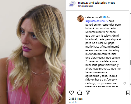“Hola, pensé en no responder, pero lo haré con mucho cariño. Mi familia no tiene nada que ver con la televisión ni lo actoral; sería genial que sí, pero no es así. Mi papá murió hace años y mi mamá es emprendedora”, reaccionó, explicándole con respeto su situación.