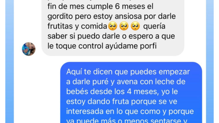 “Yo le estoy dando fruta porque se ve interesada en lo que como y porque ya puede más o menos sentarse y meterse objetos a la boca”, señaló.