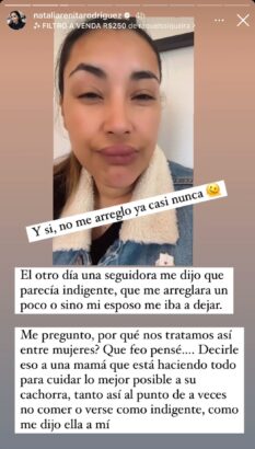 “El otro día una seguidora me dijo que parecía indigente, que me arreglara un poco o si no mi esposo me iba a dejar”, partió señalando en la historia.