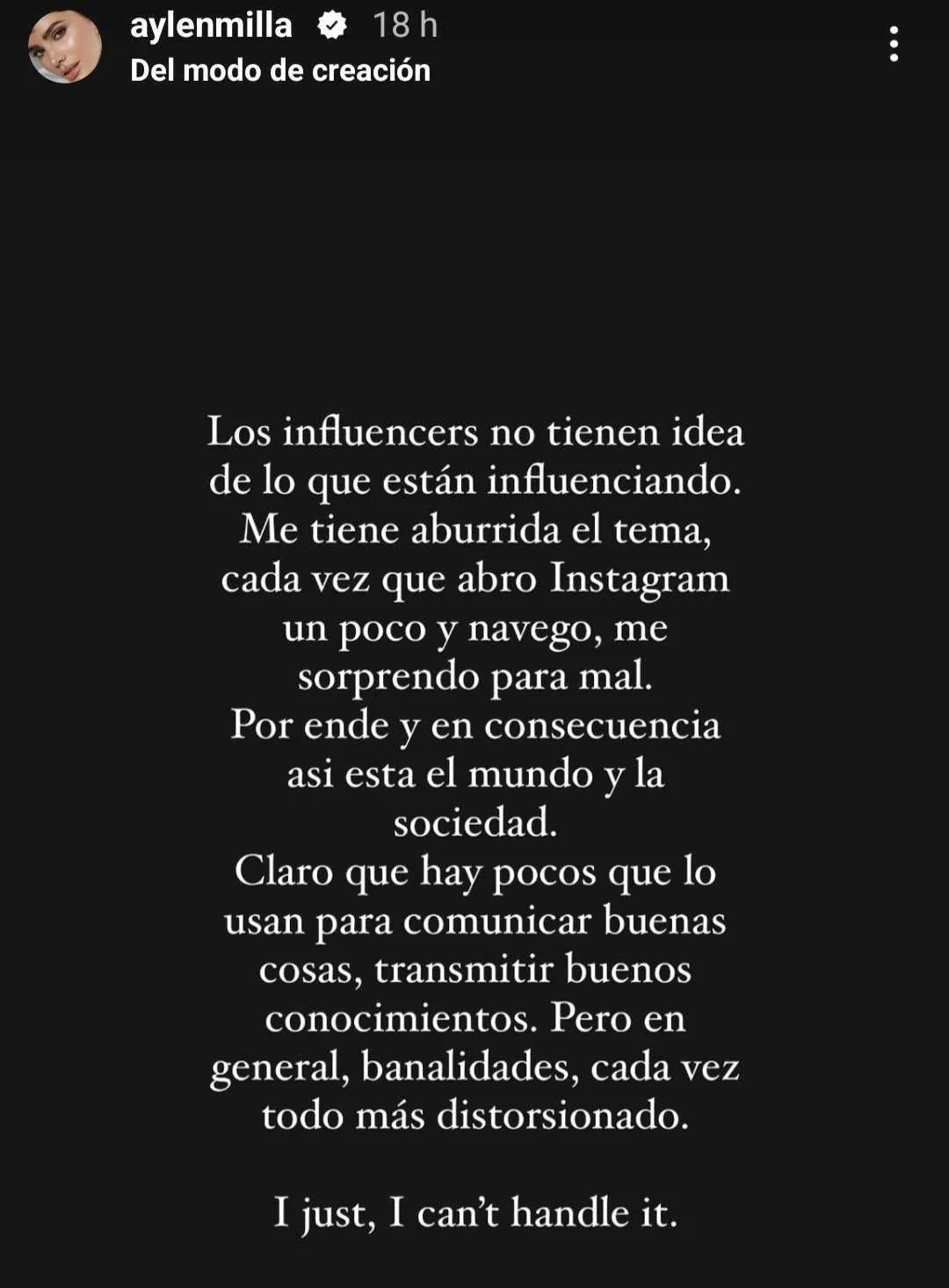 Aylén Milla compartió su molestia contra los influencers a través de su cuenta de Instagram.