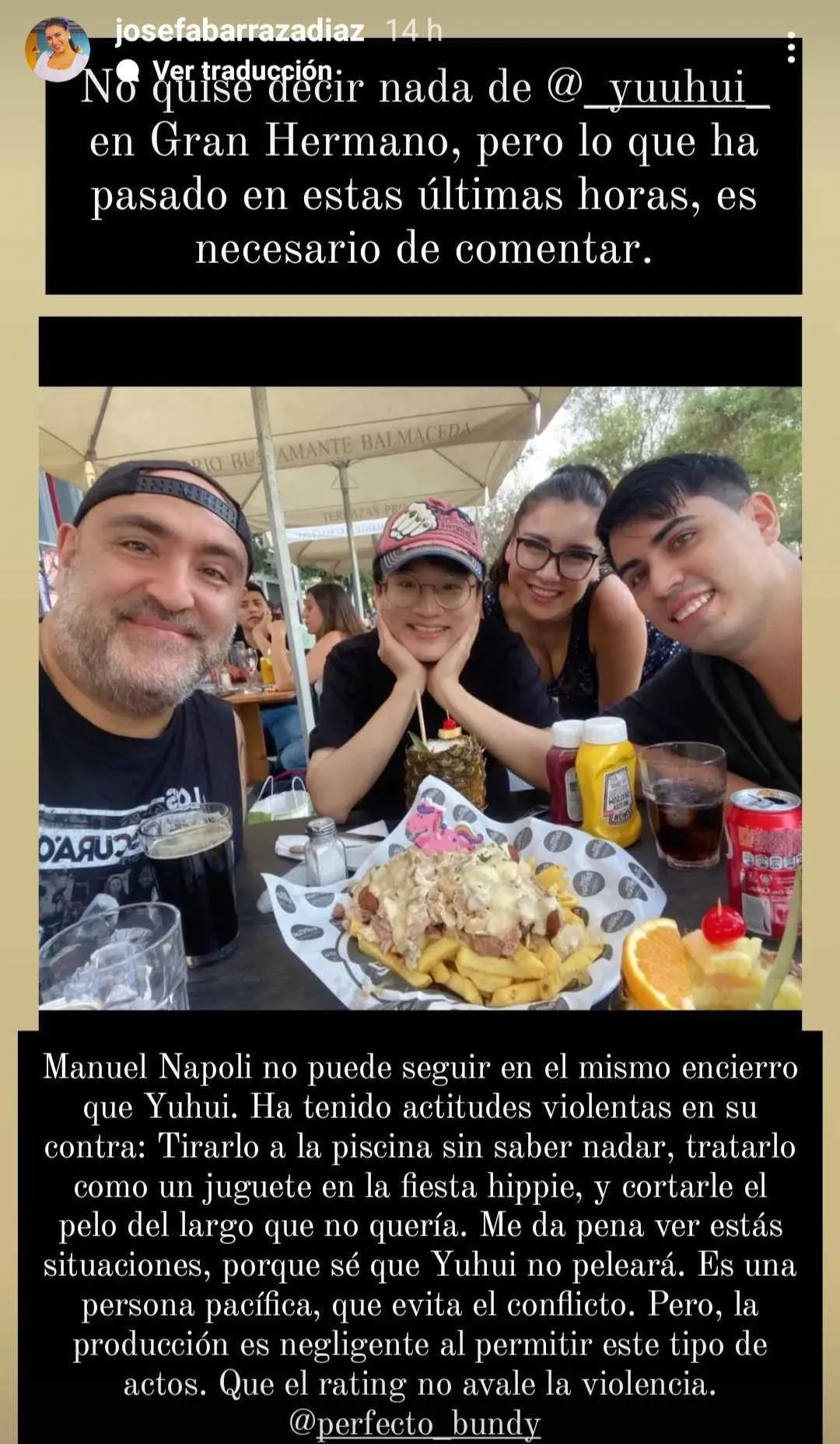 Por su parte, Perfecto Bundy tambén compartió un mensaje, en donde destacó la personalidad de Yuhui y también apuntó contra el jugador italiano de Gran Hermano.