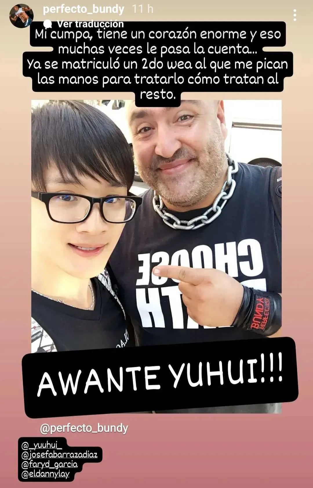 "Mi compa tiene un corazón enorme y eso muchas veces le pasa la cuenta. Ya se matriculó un segundo 'wea' al que me pican las manos para tratarlo cómo tratan al resto. Aguante Yuhui", escribió en una de sus stories de Instagram.