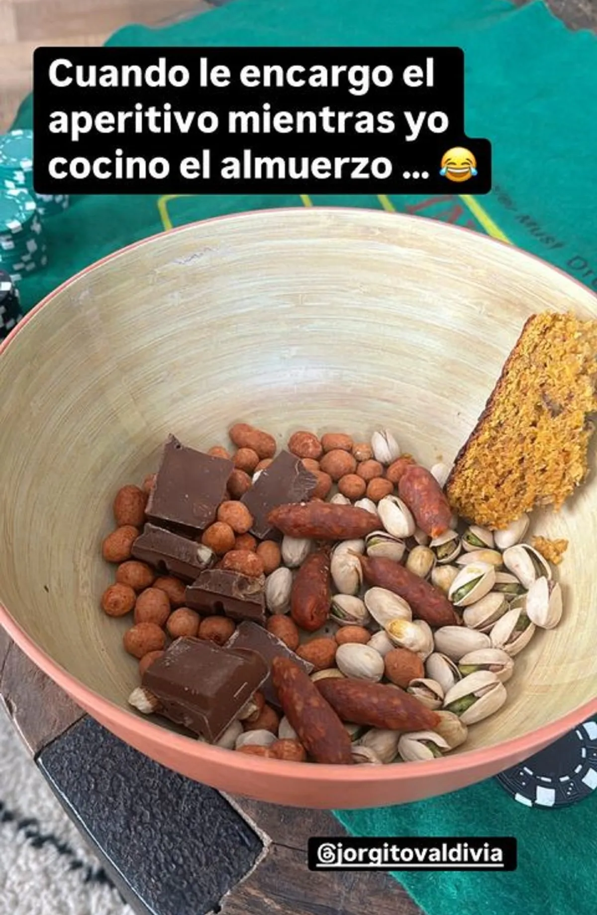 Si bien integró una buena variedad de aperitivos, como pistachos, chocolate, salame y mani japonés; Valdivia puso todo en un solo bowl, sin ninguna decoración u orden.