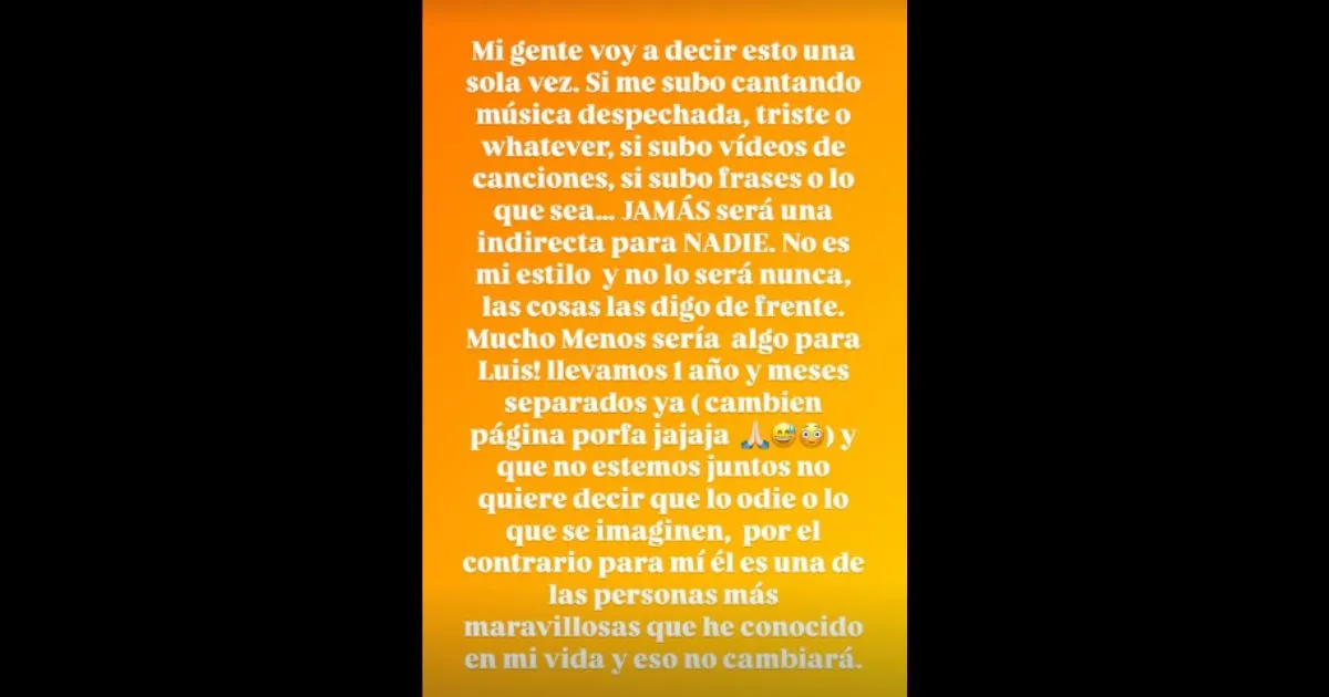 Además, enfatizó que sus posteos no tienen relación con Jiménez: "Mucho menos sería algo para Luis. Llevamos 1 año y meses separados (cambien la página, por favor). Que no estemos juntos no quiere decir que lo odie o lo que se imaginen".