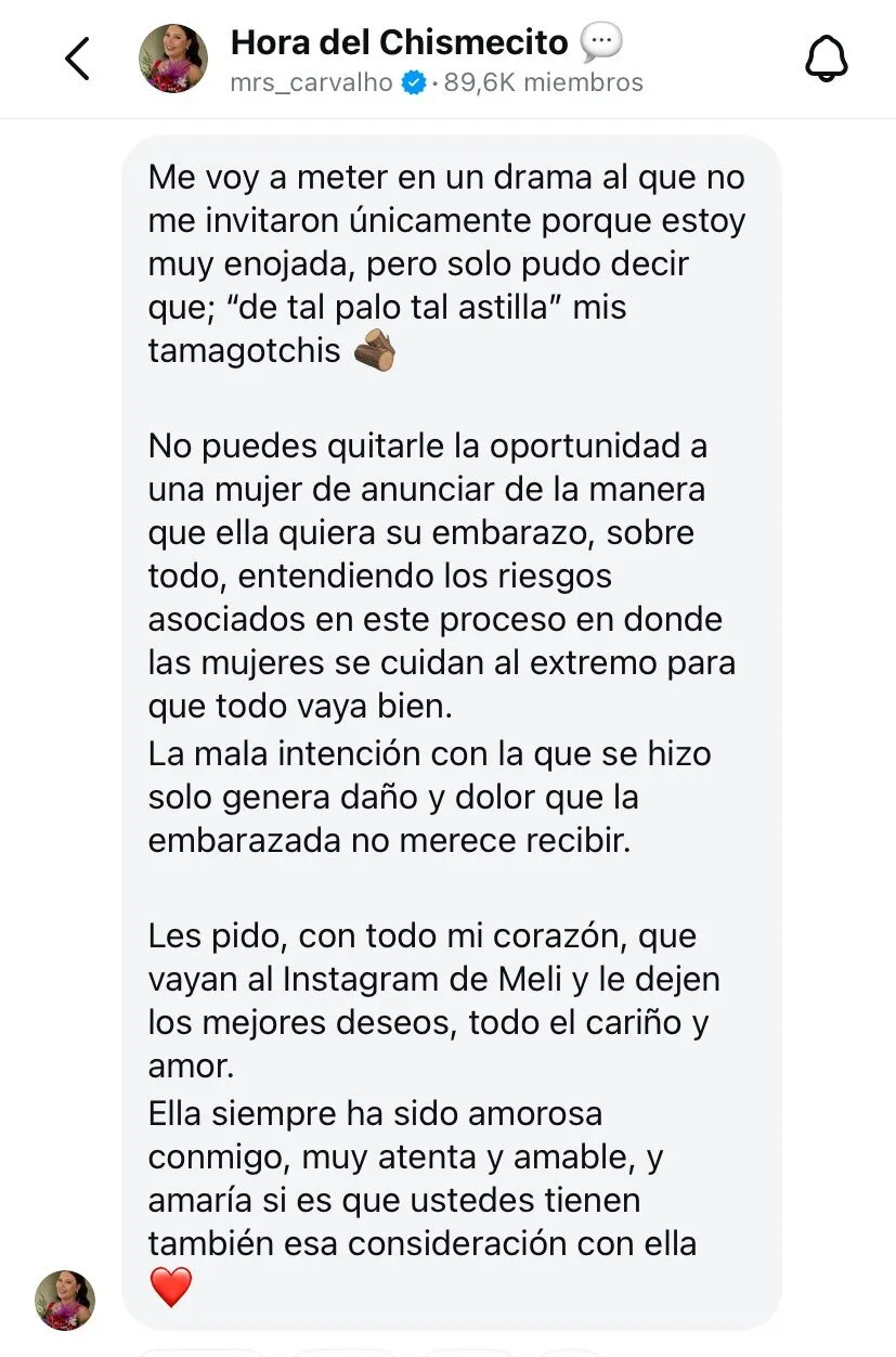 “Les pido, con todo mi corazón, que vayan al Instagram de Meli y le dejen los mejores deseos, todo el cariño y amor. Ella siempre ha sido amorosa conmigo, muy amable y atenta, y amaría si es que ustedes tienen también esa consideración con ella”, cerró.