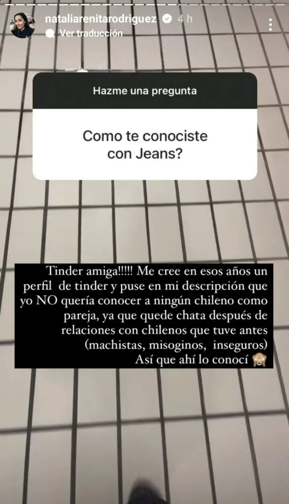 Lo anterior, argumentó, “ya que quedé chata después de relaciones con chilenos que tuve antes (machistas, misóginos, inseguros). Así que ahí lo conocí", añadió.