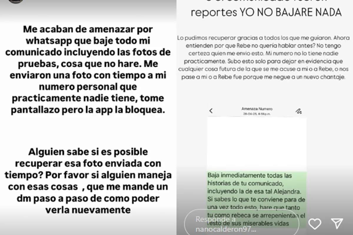 A solo horas de dichas denuncias en redes sociales, Nano Calderón utilizó nuevamente sus historias para señalar que estaba recibiendo amenazas en su número personal.