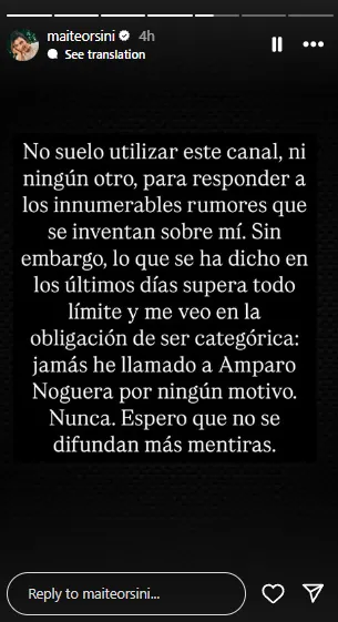Así, a través de sus redes sociales, Orsini comenzó diciendo que: “No suelo utilizar este canal, ni ningún otro, para responder a los innumerables rumores que se inventan sobre mí”.