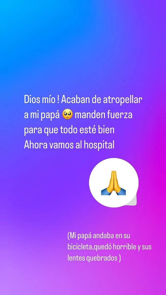 “Dios mío. Acaban de atropellar a mi papá. Manden fuerza para que todo esté bien. Ahora vamos al hospital (Mi papá andaba en su bicicleta, quedó horrible y sus lentes quebrados)”, escribió.