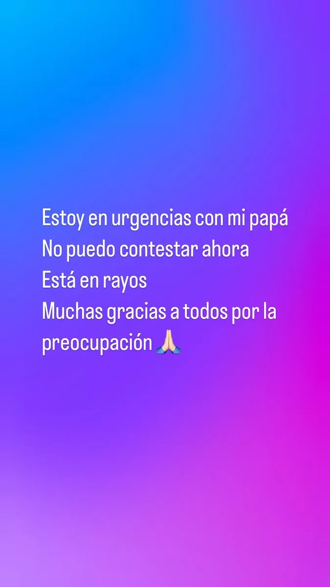 “Estoy en urgencia con mi papá. No puedo contestar ahora, estoy en rayos (radiografías). Muchas gracias a todos por la preocupación”, indicó.